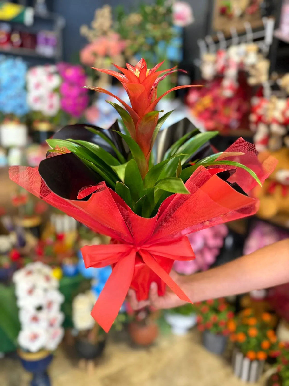 "Kırmızı guzmanya saksı çiçeği, kırmızı kurdele, kırmızı elyaf ve beyaz tül harika bir görsel uyum yakalayan Kırmızı Guzmanya Saksı Çiçeği aranjmanı hayatınızdaki özel insanları mutlu etmenin en şık yolu olacak. Türkiye'nin en yeni çiçek sipariş sitesi olan osmaniyecicek.net, her biri birbirinden şık özel tsarım aranjmanları sadece bir tık uzağınızda. " Saksı Kırmızı Guzmanya Bitkisi: 1 Adet Yaklaşık Ürün Boyutu: 35cm NOT: Stok durumuna bağlı olarak ürünün çiçek rengi kırmızı, yeşil ve sarı renklerde olabilmektedir. Guzmanya çiçeği, şık ve gösterişli görünümü ile en çok tercih edilen hediye çiçek aranjmanlarındandır. Ofise çiçek siparişi ya da eve çiçek siparişi için sık sık tercih edilen guzmanya saksı çiçeği, uzun süre bozulmaması ve gösterişinden bir şey kaybetmemesi gibi özellikleriyle bilinir. Guzmanya çiçeği anlamı; bereket ve bolluk olarak bilinir. Daha çok yeni iş, yeni ev gibi kutlamalarda bu sebeple tercih edilmektedir. Kırmızı Guzmanya Saksı Çiçeği ile siz de sevdiklerinizin yeni heyecanlarında yanlarında olabilirsiniz. Guzmanya Çiçeği Bakımı Nasıl Yapılır? Guzmanya çiçeğinin bakımı da oldukça kolaydır. En önemli bakım özelliği doğrudan güneş almayacak bir yerde konumlandırılmasıdır. Guzmanya çiçeğinin güneş alan kısmı belli aralıklarla döndürülmelidir. Böylece karanlık kısımda yer alan bölümler de zamanla gelişecek ve güzel bir şekilde çiçek verecektir. Ayrıca az ışık alan bölümler zamanla da çürüyebilmektedir. Bu gibi sonuçlarla karşılaşmamak adına güneş ışığı eşit zaman aralıklarıyla Guzmanya çiçeğine döndürülmelidir. Guzmanya Çiçeği Nasıl Sulanmalıdır? Guzmanya çiçeği yazın haftada 2 kez, kışın ise haftada 1 kez sulanmalıdır. Bu sulama işlemi üst kısımdan başlayacak ve çiçeklere gelecek şekilde başlanmalıdır. Daha sonra saksıya doğru sulama tamamlanır. Guzmanya çiçeğinin toprağını değiştirmemeye de özen gösteriniz.