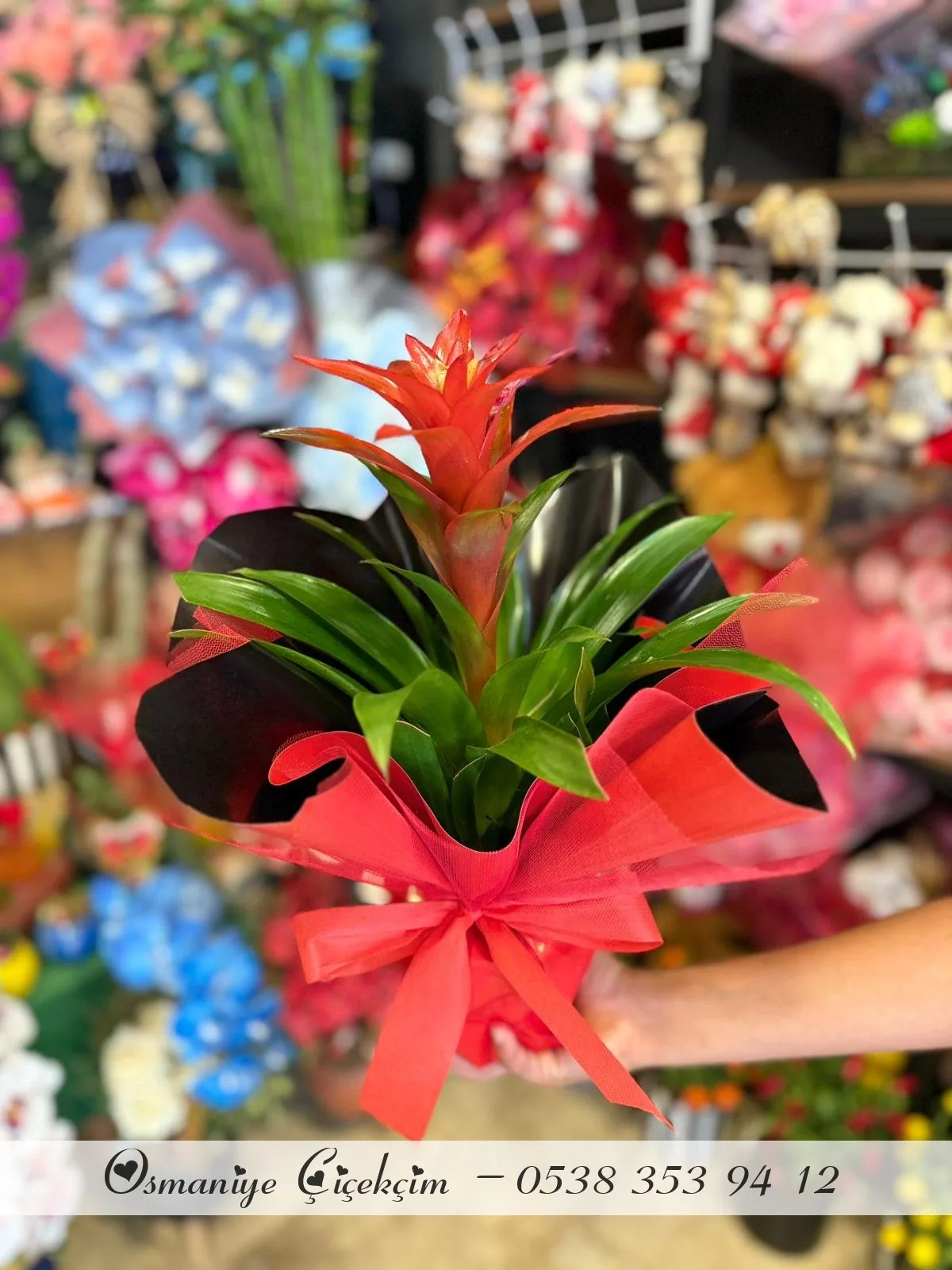 "Kırmızı guzmanya saksı çiçeği, kırmızı kurdele, kırmızı elyaf ve beyaz tül harika bir görsel uyum yakalayan Kırmızı Guzmanya Saksı Çiçeği aranjmanı hayatınızdaki özel insanları mutlu etmenin en şık yolu olacak. Türkiye'nin en yeni çiçek sipariş sitesi olan osmaniyecicek.net, her biri birbirinden şık özel tsarım aranjmanları sadece bir tık uzağınızda. " Saksı Kırmızı Guzmanya Bitkisi: 1 Adet Yaklaşık Ürün Boyutu: 35cm NOT: Stok durumuna bağlı olarak ürünün çiçek rengi kırmızı, yeşil ve sarı renklerde olabilmektedir. Guzmanya çiçeği, şık ve gösterişli görünümü ile en çok tercih edilen hediye çiçek aranjmanlarındandır. Ofise çiçek siparişi ya da eve çiçek siparişi için sık sık tercih edilen guzmanya saksı çiçeği, uzun süre bozulmaması ve gösterişinden bir şey kaybetmemesi gibi özellikleriyle bilinir. Guzmanya çiçeği anlamı; bereket ve bolluk olarak bilinir. Daha çok yeni iş, yeni ev gibi kutlamalarda bu sebeple tercih edilmektedir. Kırmızı Guzmanya Saksı Çiçeği ile siz de sevdiklerinizin yeni heyecanlarında yanlarında olabilirsiniz. Guzmanya Çiçeği Bakımı Nasıl Yapılır? Guzmanya çiçeğinin bakımı da oldukça kolaydır. En önemli bakım özelliği doğrudan güneş almayacak bir yerde konumlandırılmasıdır. Guzmanya çiçeğinin güneş alan kısmı belli aralıklarla döndürülmelidir. Böylece karanlık kısımda yer alan bölümler de zamanla gelişecek ve güzel bir şekilde çiçek verecektir. Ayrıca az ışık alan bölümler zamanla da çürüyebilmektedir. Bu gibi sonuçlarla karşılaşmamak adına güneş ışığı eşit zaman aralıklarıyla Guzmanya çiçeğine döndürülmelidir. Guzmanya Çiçeği Nasıl Sulanmalıdır? Guzmanya çiçeği yazın haftada 2 kez, kışın ise haftada 1 kez sulanmalıdır. Bu sulama işlemi üst kısımdan başlayacak ve çiçeklere gelecek şekilde başlanmalıdır. Daha sonra saksıya doğru sulama tamamlanır. Guzmanya çiçeğinin toprağını değiştirmemeye de özen gösteriniz.